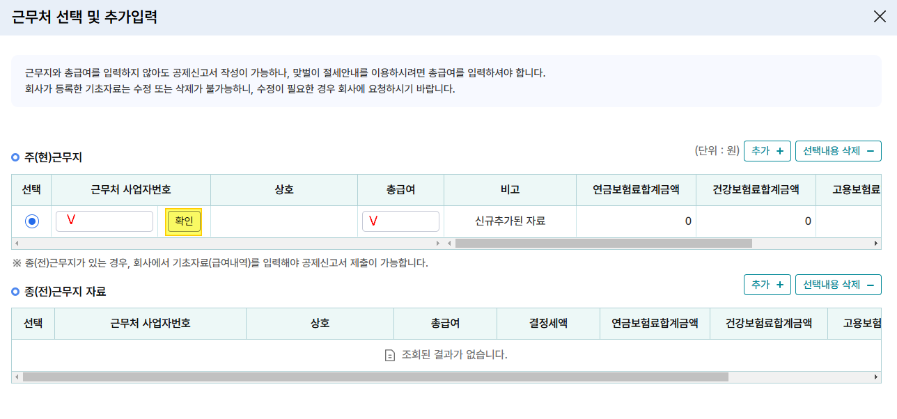 근무처, 총급여는 사업자번호에서 수정/추가입력 눌러 등록가능합니다.