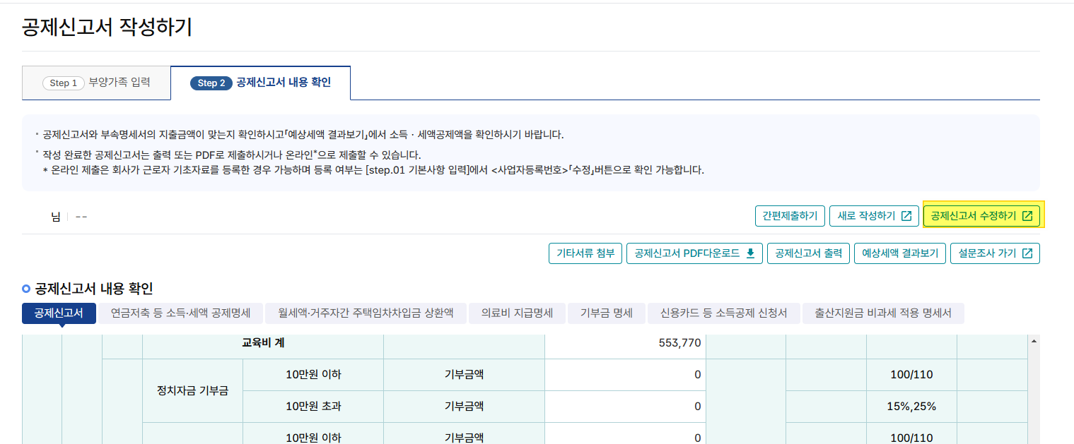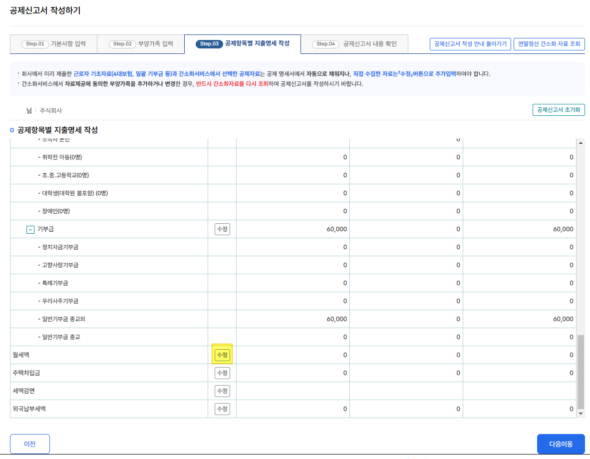 기부금이나 의료비 등 안맞는 부분이 있으면 수정을 눌러서