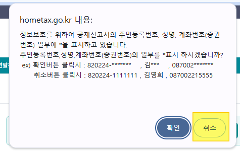 취소를 눌러서 주민등록번호, 성명, 계좌번호 등을 다 공개하여 PDF다운로드받습니다.