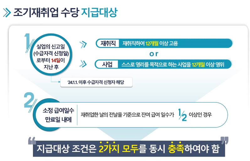 즉, 재취업 후 12개월 이상 근무 또는 사업 운영을 해야 하며, 남은 실업급여 일수도 절반 이상이어야 지급됨!
