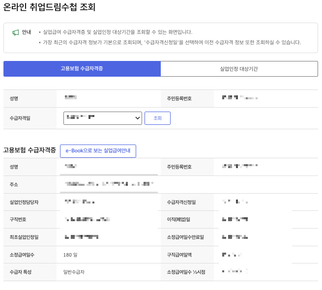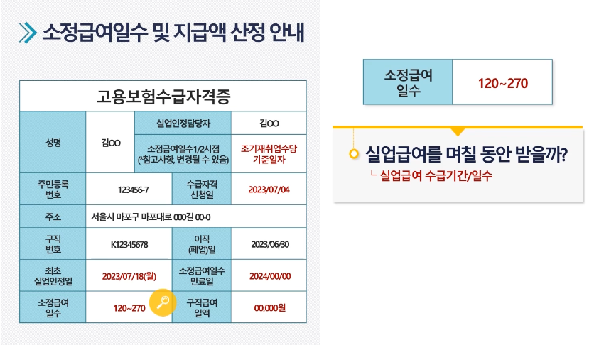 구직급여일액, 소정급여일수, 소정급여일수 1/2시점, 소정급여일수만료일 등을 확인할 수 있다.