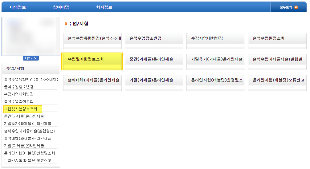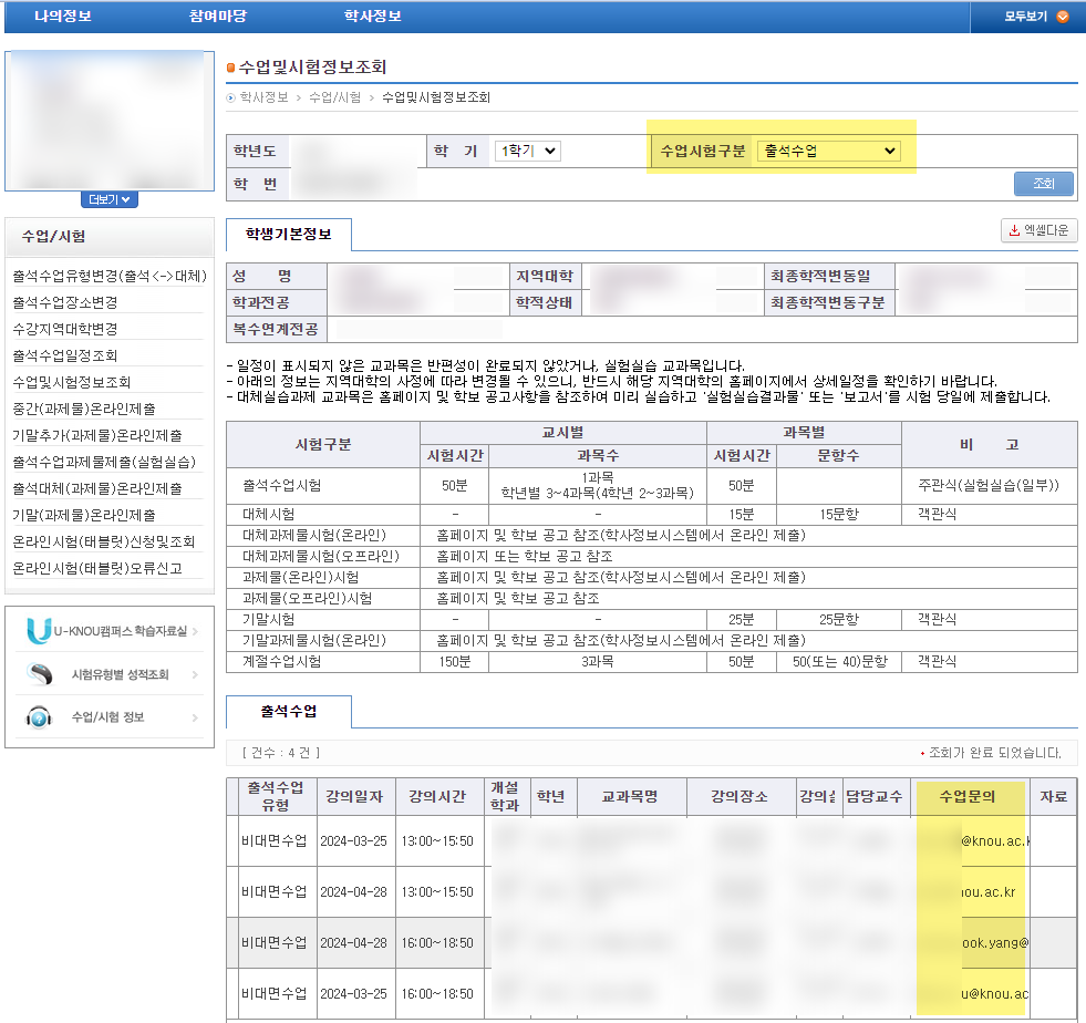 - 수업시험구분 > 출석수업 선택 > 조회 버튼 누릅니다.