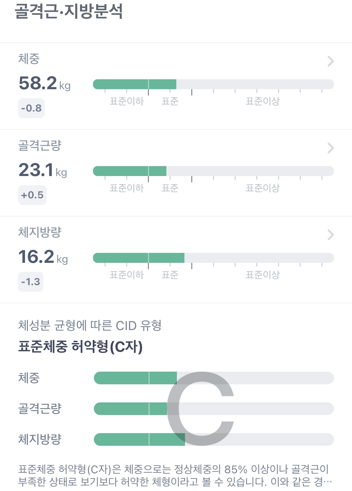 + 0.9kg - 체지방량 16.8 -> 16.2