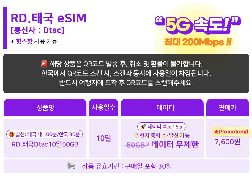 (상품설명 이미지는 7600원이지만 7,070원인듯/ ~24년 12월 31일까지 프로모션) - 태국 내 발신 100분/한국 30분