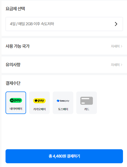 - 4일 매일 2GB 이후 속도저하(QoS(저속) : 384kbps)