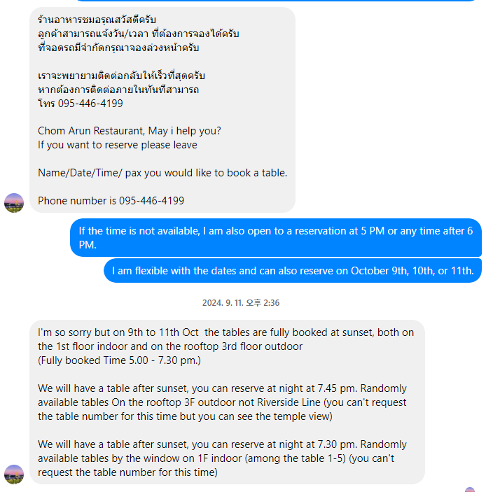 촘아룬예약은 페북메시지로 하는데 약 한달전에 물어봤더니 7시30분 이후에 루프탑3층자리(강쪽X) 있다고해서