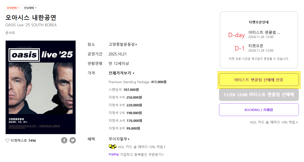 오아시스 내한공연 선예매 티켓팅 날이다.
