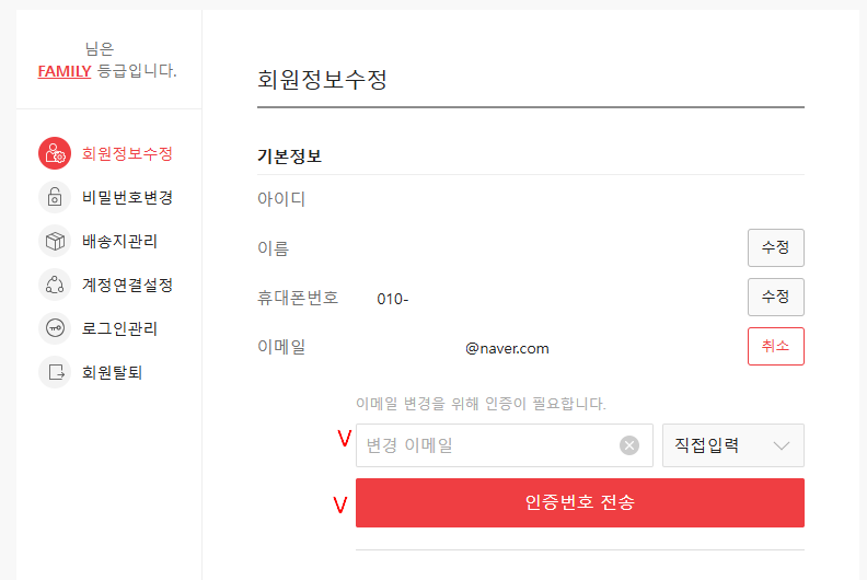 인증번호를 전송하여 인증하면, 변경이 완료된다.
