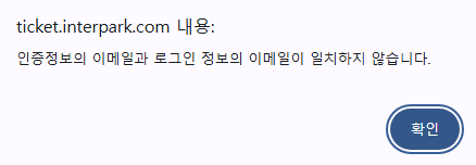 인증번호의 이메일과 로그인 정보의 이메일이 일치하지 않습니다.